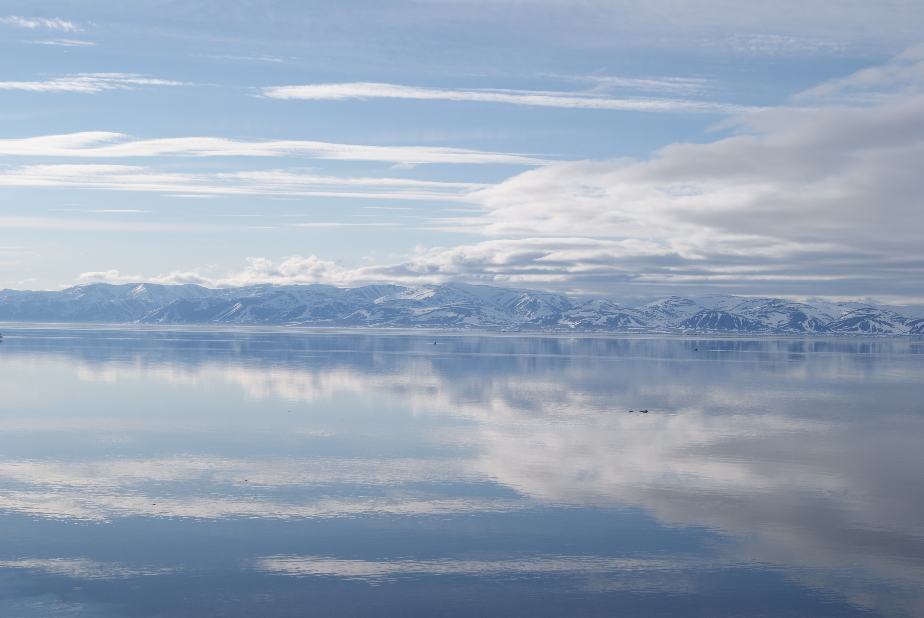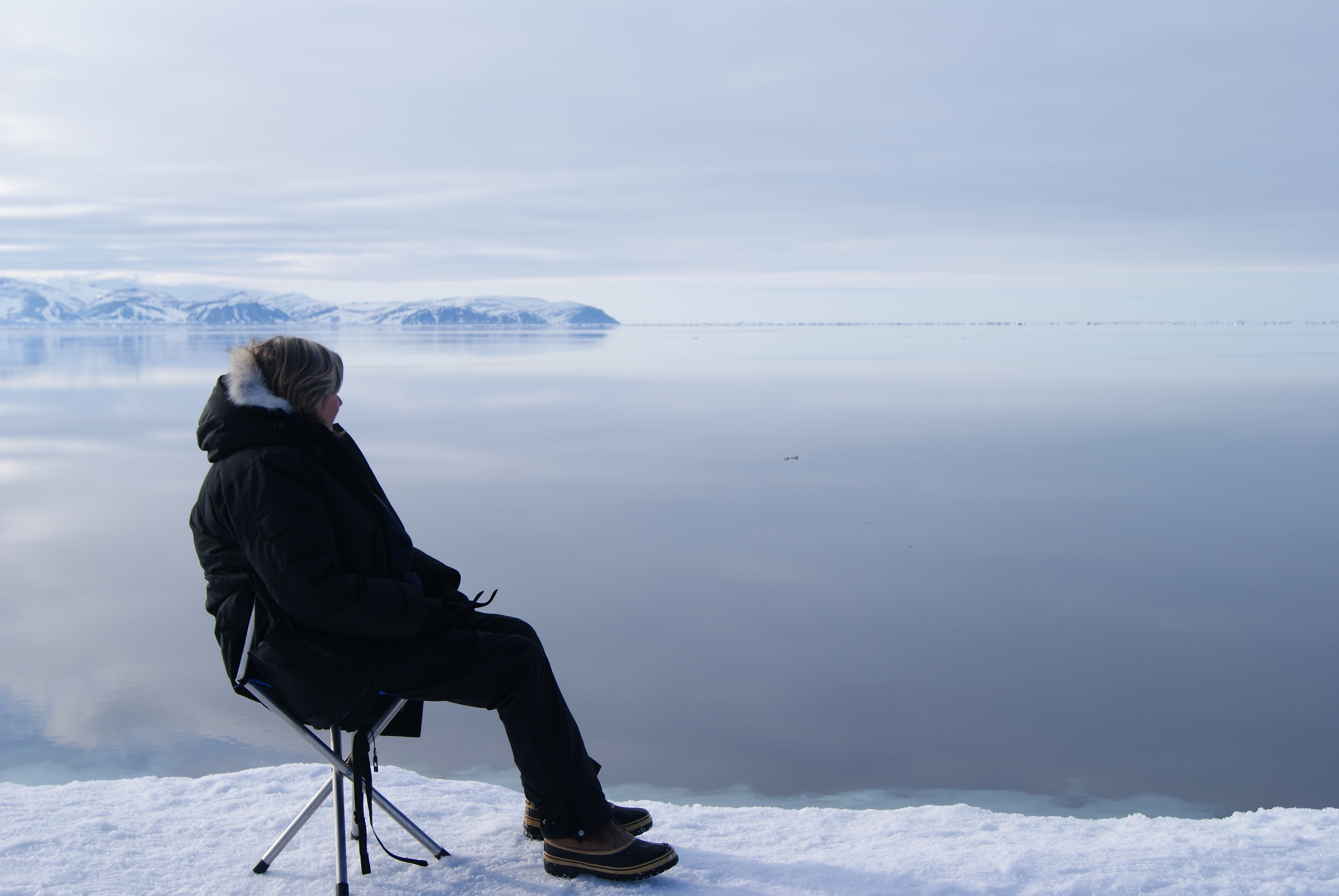 Sitting right out on the floe edge with Bylot Island, which is a migratory bird sanctuary over the water in the distance, we had a microphone in the crystal clear water as we listened to the whales talking in the distance it was so quiet and still.