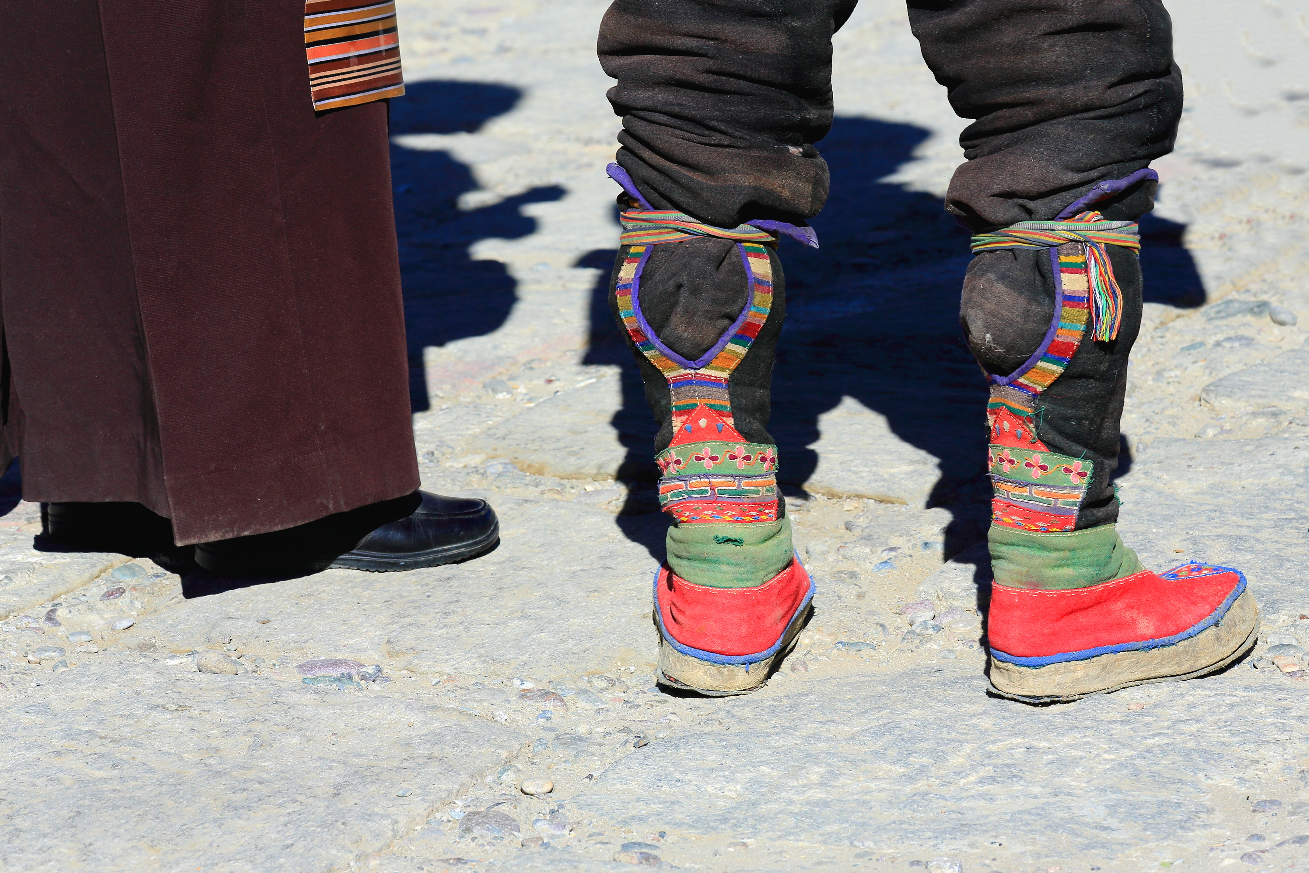 Traditional Tibetan boots have a skin sole with felted yak wool leggings decorated with embroidery and tied at the top with a woven belt. Feet are kept warm with straw stuffed and stitched tightly into the sole.